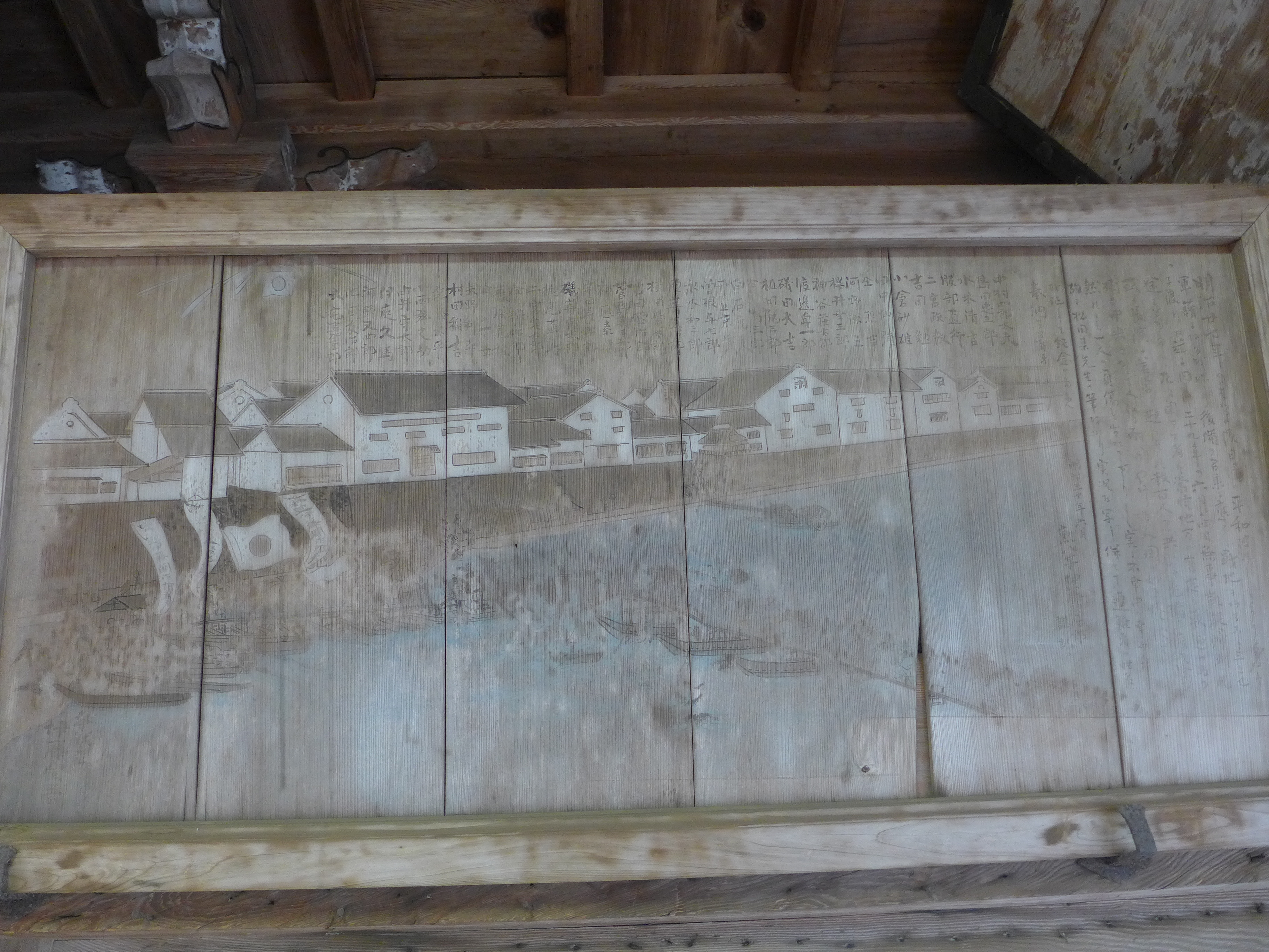 当社の拝殿(一番手前の殿)に入って右手に掲げられているのが大洲藩武成隊奉納の絵馬。縦150cm,横220cmと巨大な絵馬です。