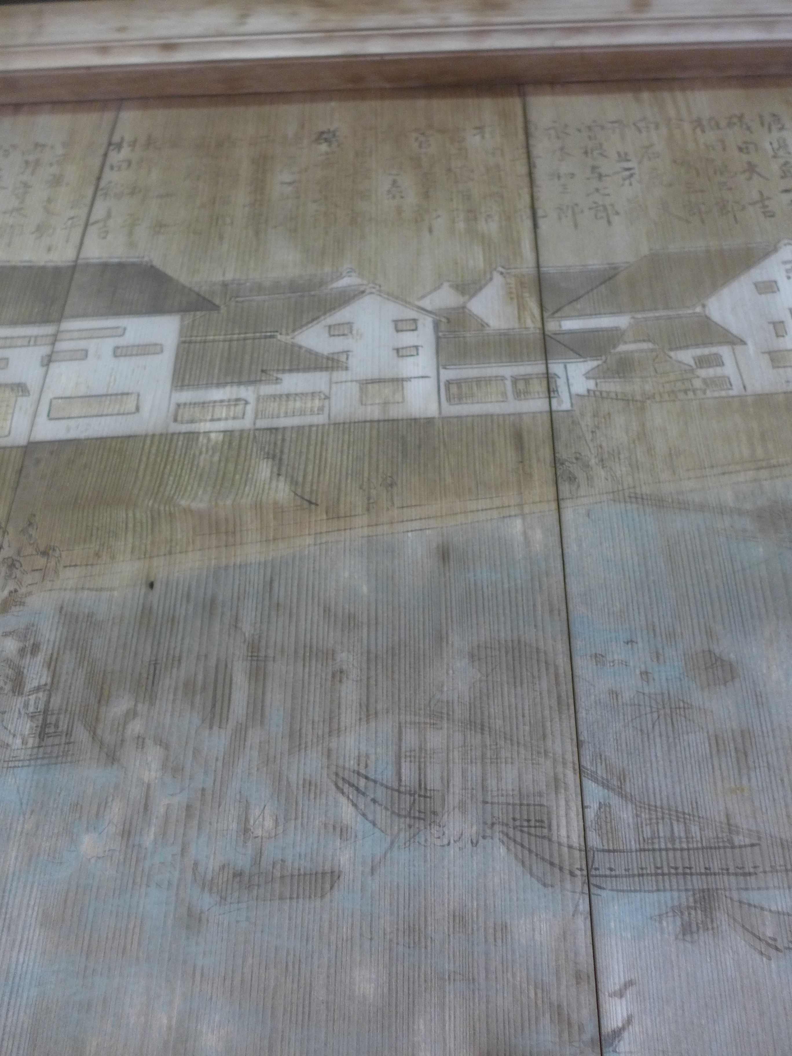 吹き込む雨風などによってかなり色あせてしまっていますが、白壁の町並みに川と船、そしてその上に渡された板とたくさんの人らしき姿が見えるでしょうか↓(画像クリックで拡大)。