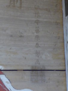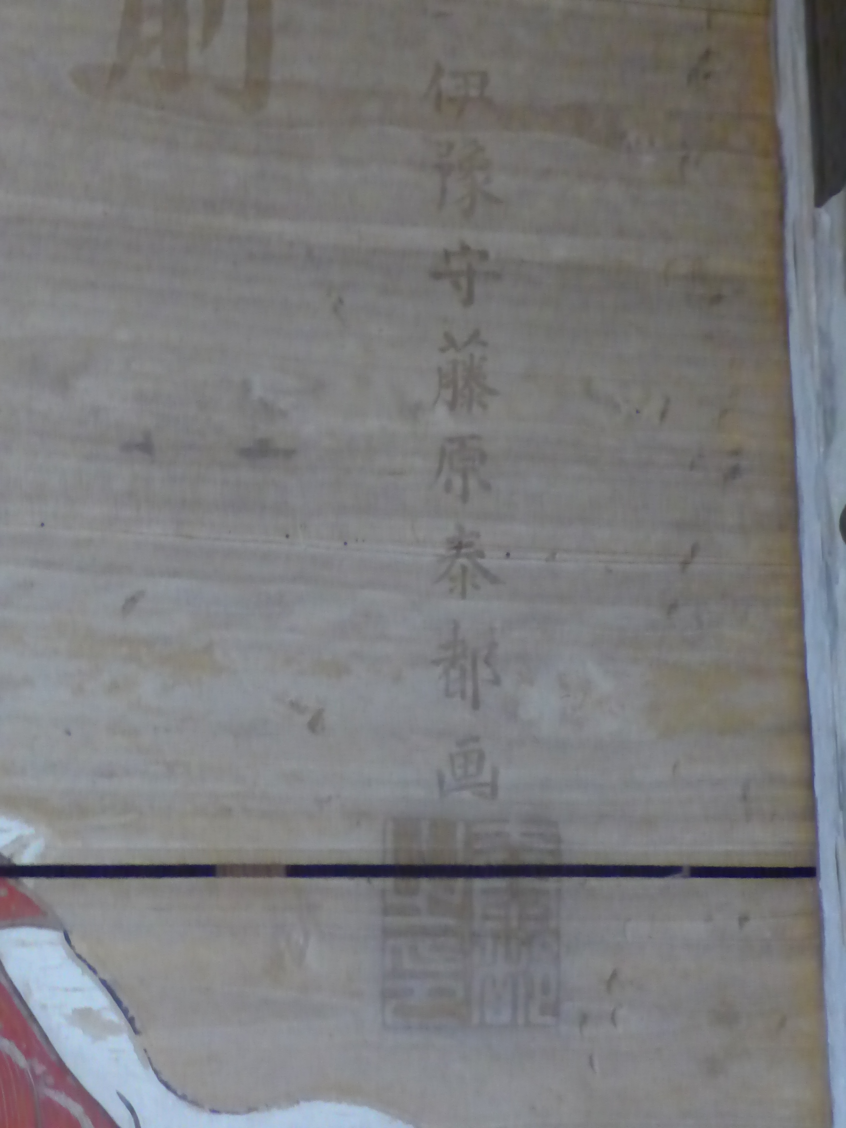 加藤文麗は、宝永3年(1706年)生まれ。大洲藩3代藩主加藤泰恒の6男で、本名を加藤泰都(さと)といい、大叔父である加藤泰茂の養子となって家督を相続しました。寛延3年(1750)には、従五位下伊予守に叙せられています。この絵馬にも「伊豫守 藤原(藤原は姓。名字は加藤)泰都画」とあります↓(写真クリックで拡大)。