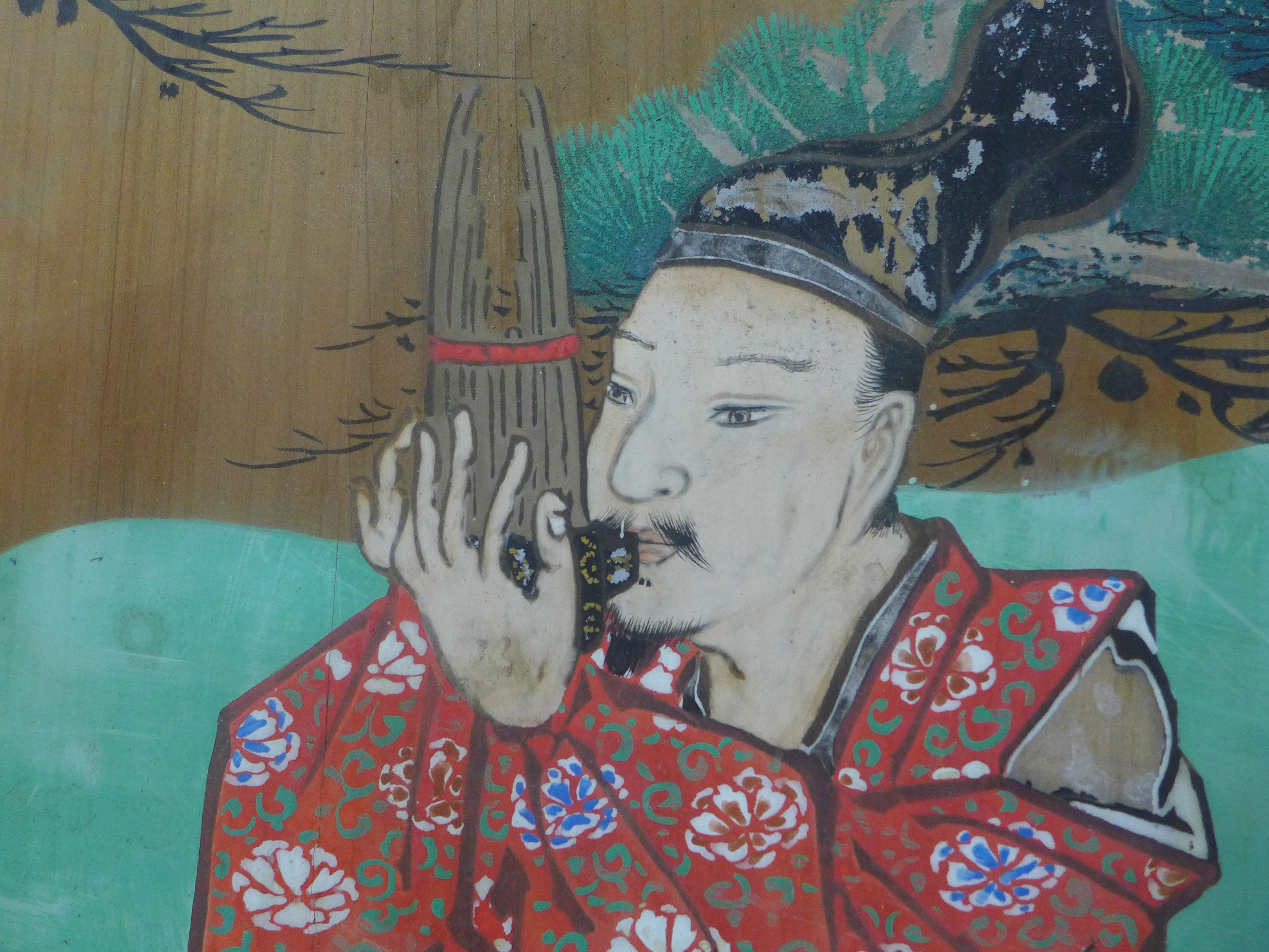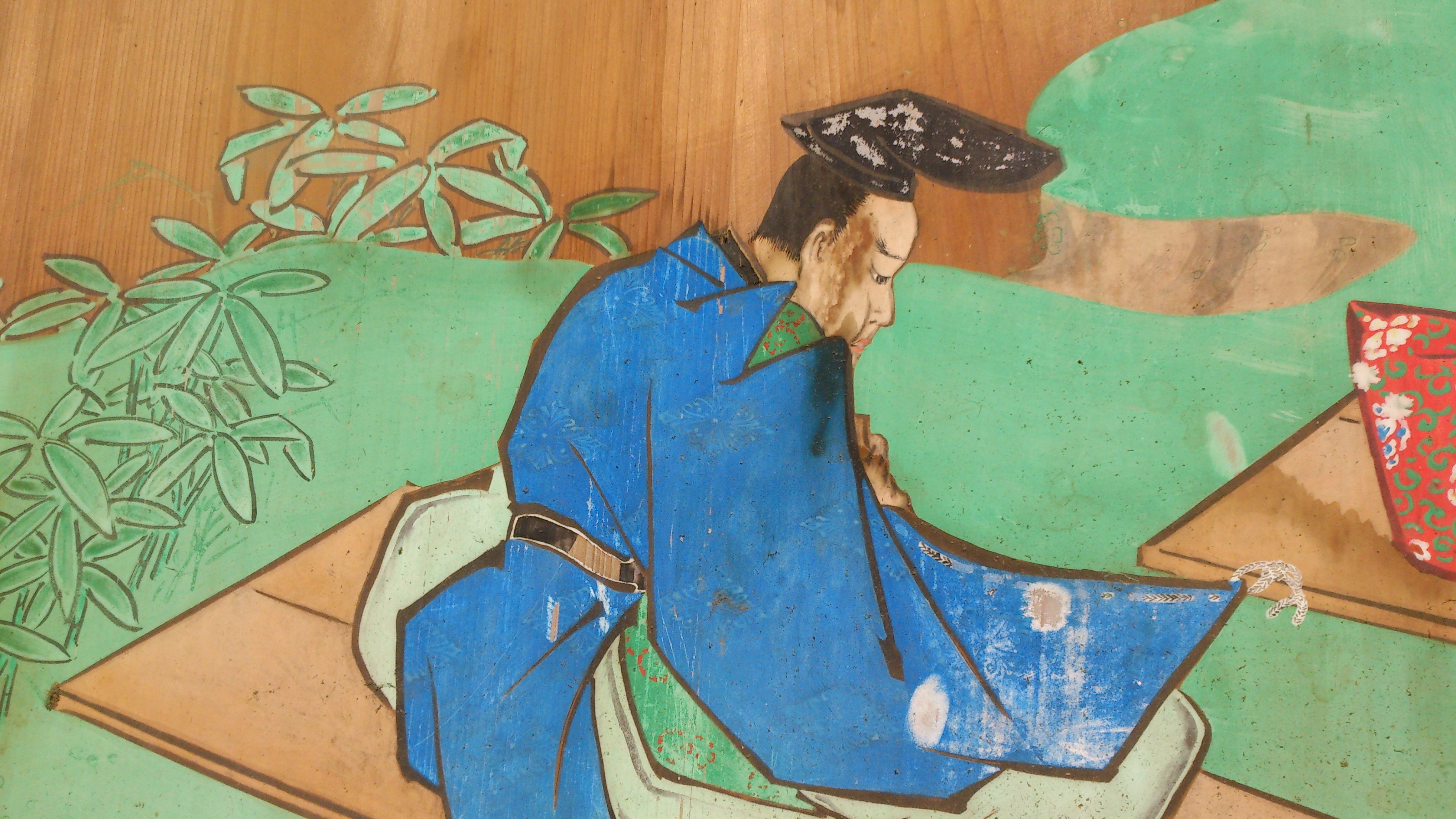 この絵馬に描かれた源義光(右側の赤い装束)は平安時代中期の武将で、射術に優れ、新羅明神の社前で元服したころから“新羅三郎”とも呼ばれ、雅楽の笙(しょう)の名人として名を馳せました。この絵馬でも笙を吹いているのがわかります。