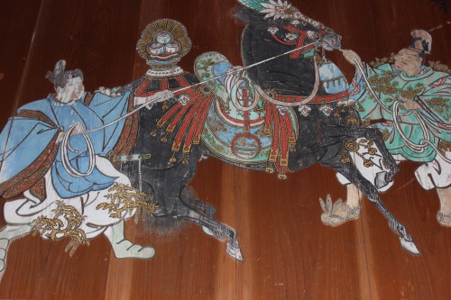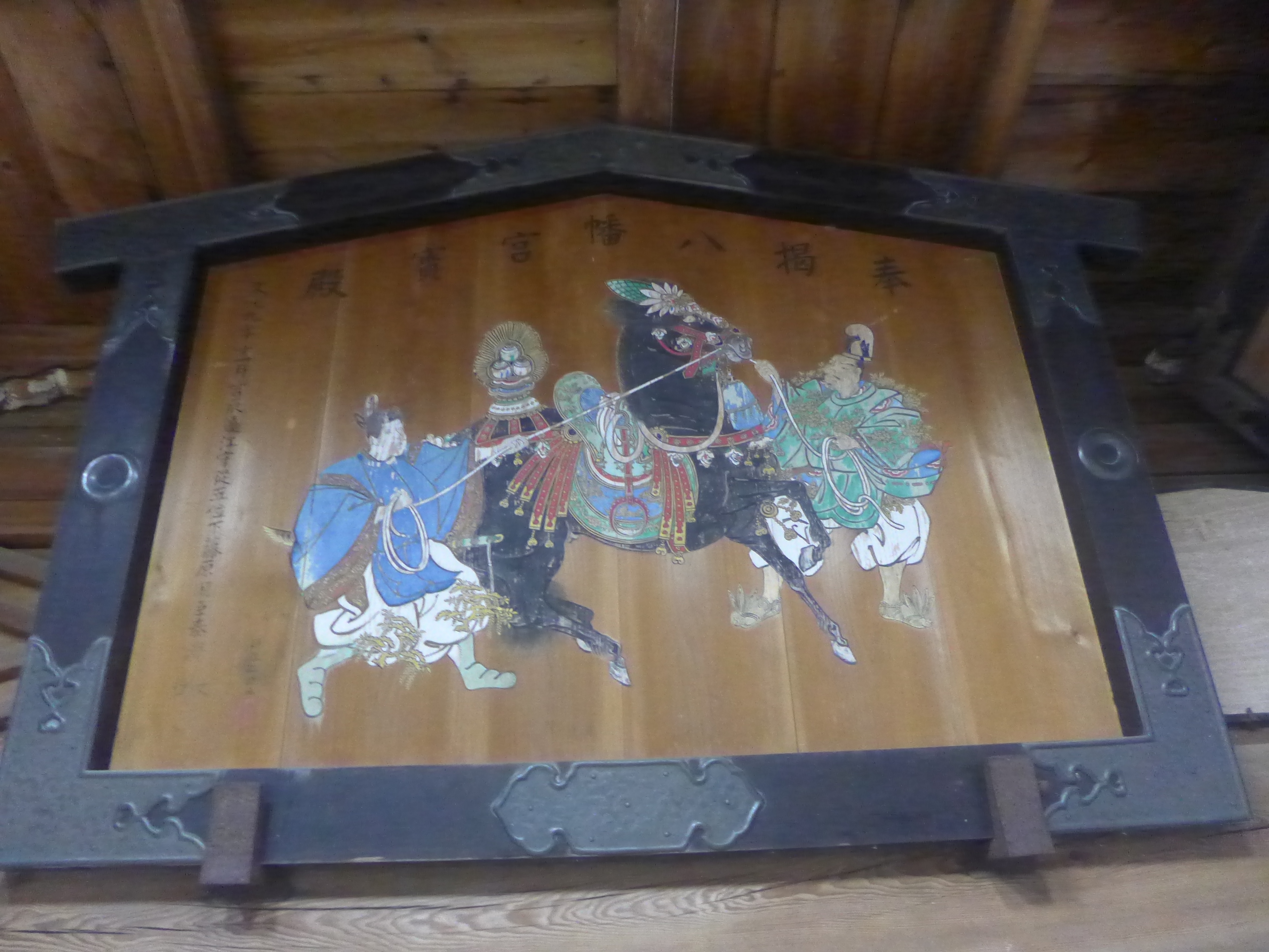 奉納されたのは文化9年(1813)。約200年前と比較的新しい時代のものだけに、比較的色彩も残ってくれています。馬の装具の飾りの美しさが伝わってきますね。それにしても、馬の口取りさんの膝や衣裳に松の枝のようなものが付いていますが、これは単に飾りということなのでしょうか。う~む、もっと勉強せねば・・・。