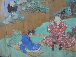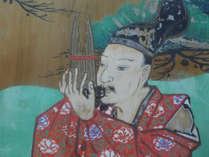 時秋はそう言うと懐から笙を取りだし ました。義家は腰の矢入れから一枚の紙を取り出しました。「これは、あ なたの父上が書かれた大食調入調(たいしきちょうにっちょう)の譜です。さあ、お教えいたしましょう」。こ の秘曲は昔、義光が時元から伝授を受けたものでした。時元が亡くなったとき時秋はまだ子供でこの曲を教わっていませんでした。このことを知っていた時秋 は、豊原家の秘曲が絶えることを危惧し、この曲の伝授を受けるためにやって来たのでした。しかし、命を賭して奥州に向かうさ最中の義光に「秘曲を伝授して欲しい」などとは言えな かったのでしょう。義光が秘曲のことに気づいてくれない場合は、奥州で討ち死にする覚悟で付いて来たのだといわれています。そして月明かりの下、義光は時秋に入調の秘曲を授けたのでした。義光は、この若者の心がけに感心すると共に、笙の道に専念するように諭し、時秋を都に返しました。その後時秋は笙の第一人者として活躍し、雅楽頭(うたのかみ)、楽所別当となったといわれています。
