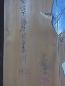 幅6尺を越える漆黒の大きな絵馬です。大洲藩主の奉納ということで、絵馬の両側に蛇の目の紋が入っています。黒馬の位置と口取りさんの位置と姿勢のバランスが絶妙で、黒馬の美しさと荒々しさがしっかり伝わってきます。言うこと聞かなそうな目してますもんね・・・(笑)