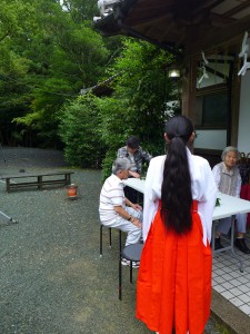 今年の生徒さんは中学2年生の女の子。ちょうど朔日(ついたち)参りの日でしたので、月次祭の様子を見学してもらった後、巫女服に着替え参拝の皆さんに抹茶とお菓子の御接待をしていただきました。
