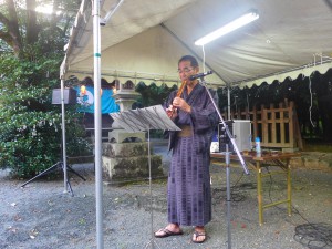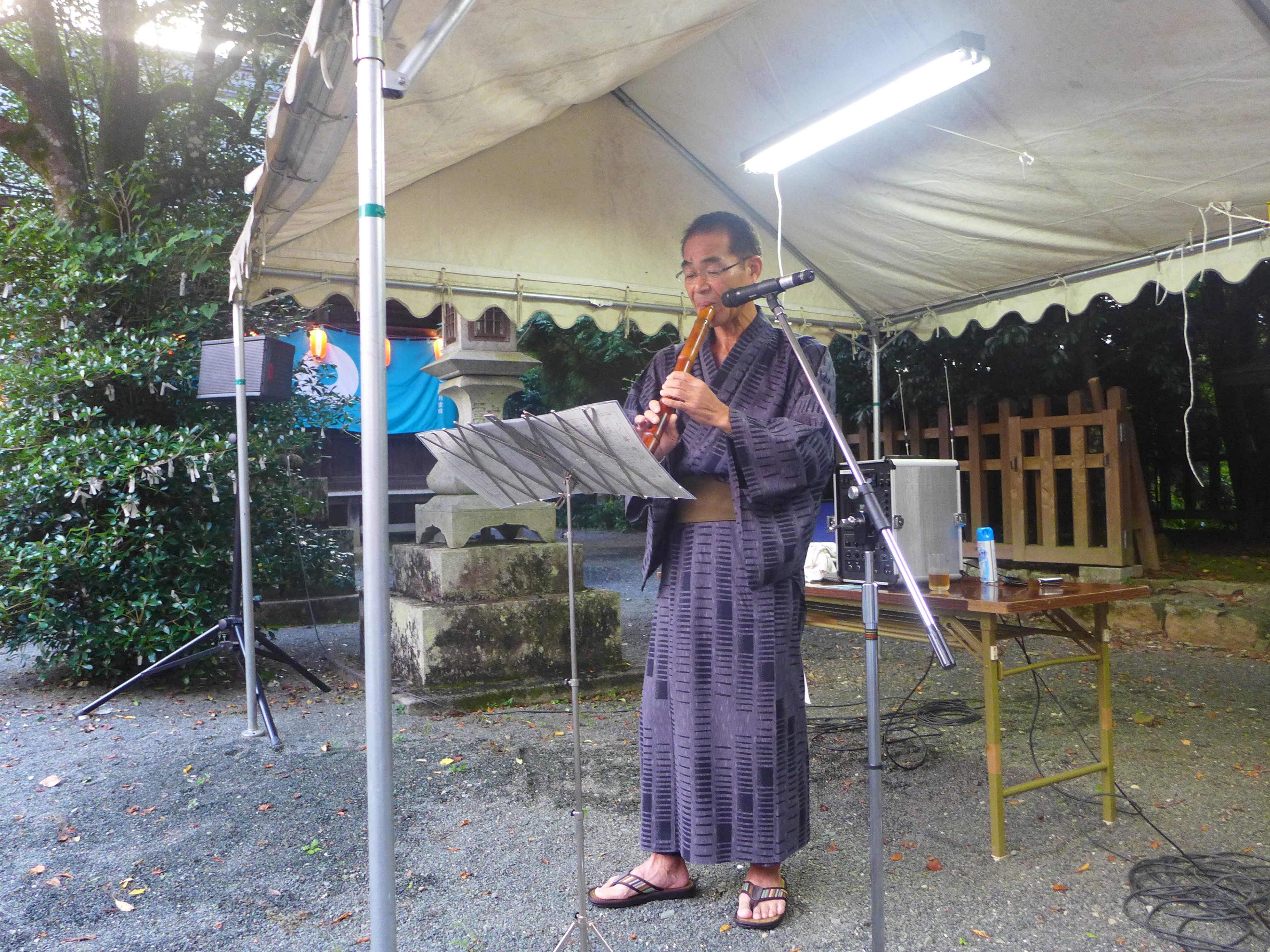 また、今年は、地元の尺八の演奏家である池田先生に、尺八の演奏をしていただきました。尺八というと、「虚無僧」「野太い音」「与作」といったイメージがあったのですが、定番から「少年時代」「ルパン三世」といった現代ポップスまで幅広いジャンルの曲を演奏いただきました。その軽やかで美しい音色に驚きました。参拝の皆さんも、立ち止まって美しい尺八の響きに聞き入っておりました。