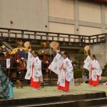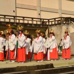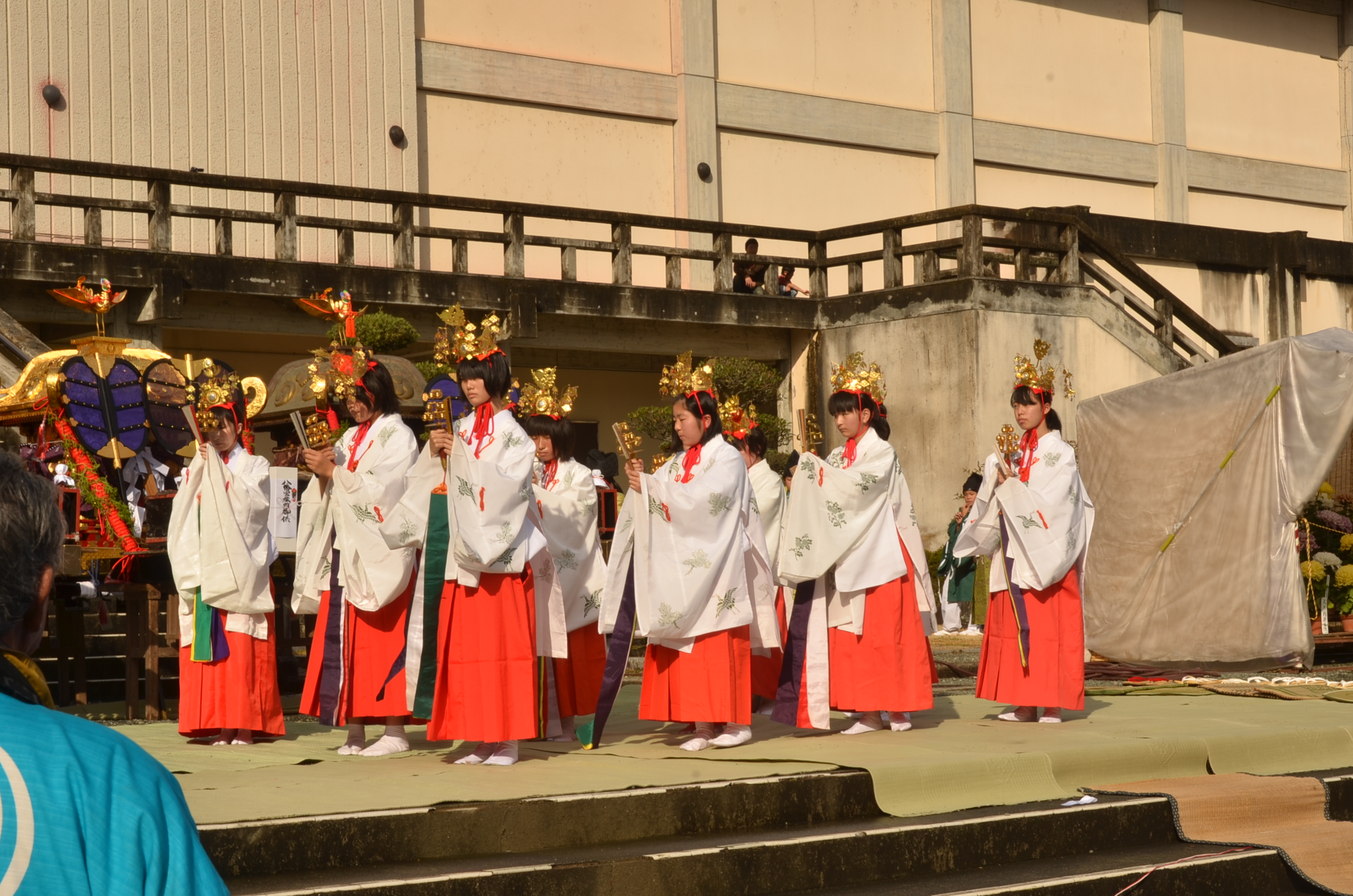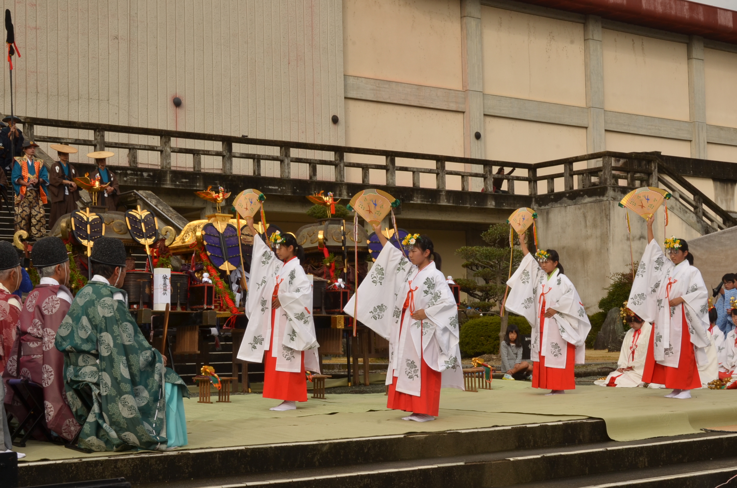そして、肱北から肱南地区へと戻り、市民会館前での御旅所祭の頃になると晴れ間も見え、心地よい日差しの中で、鈴神楽、浦安の舞奉納、肱南青年団による獅子舞奉納、そして、大洲藩鉄砲隊による奉納演武が行われました。