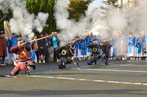 続く大洲藩鉄砲隊の演武では、轟音を響かせ、様々な打ち方を披露する大迫力の演武に、集まった人たちだけでなく、行列奉仕の小中学生たちも釘付けに(゜Д゜)。最後まで拍手が鳴り止まぬのでした(^^)
