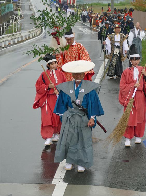 翌2日は、お成り、大名行列として知られる御神幸祭でした。今年も250名を超える皆さんにご奉仕いただき、3基の鳳輦(ほうれん:神輿)をお護りしながら、旧大洲市街を渡御いたしました。