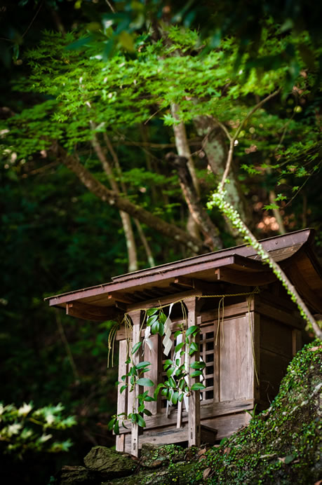 岩清水神社 御祭神:水波女命(ミズハノメノミコト) 岩清水の左手(向かって右)に鎮座する岩清水神社では、水の神様である水波女命をお祀りしています。 当社に伝わる伝説によると、その昔洪水で、柳沢(旧柿の木村)地区で祀られていた御室が当社下の肱川に流れ着き、それをお祀りしたのがはじまりとされています。それ以来、この清水は枯れることなく湧き続けています。