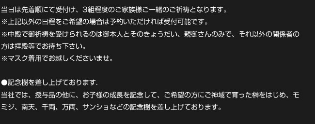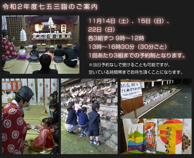 七五三詣は、子どもの健やかな成長と健康を氏神様に感謝するとともに、今後の健やかな成長を祈願する儀式です。 そのいわれは、三歳の男女児がこれまで剃ってきた髪を伸ばし始める「髪置(かみおき)」、、五歳男児が初めて袴をはく「袴着(はかまぎ)」、7歳の女児が初めて大人と同じ帯をしめる「おびと帯解き(紐解き)」の祝いにあり、平安時代から行われてきました。 当社では、ご予約頂ければいつでも七五三の御祈祷を行うことができます (御祈祷は1組ずつ行います)。
