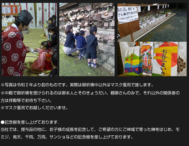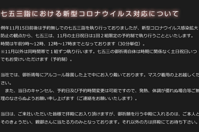 七五三詣は、子どもの健やかな成長と健康を氏神様に感謝するとともに、今後の健やかな成長を祈願する儀式です。 そのいわれは、三歳の男女児がこれまで剃ってきた髪を伸ばし始める「髪置(かみおき)」、、五歳男児が初めて袴をはく「袴着(はかまぎ)」、7歳の女児が初めて大人と同じ帯をしめる「おびと帯解き(紐解き)」の祝いにあり、平安時代から行われてきました。 当社では、ご予約頂ければいつでも七五三の御祈祷を行うことができます (御祈祷は1組ずつ行います)。