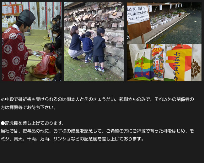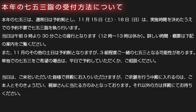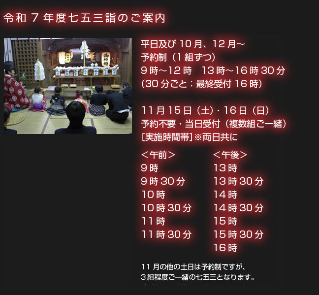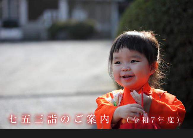 七五三詣は、子どもの健やかな成長と健康を氏神様に感謝するとともに、今後の健やかな成長を祈願する儀式です。 そのいわれは、三歳の男女児がこれまで剃ってきた髪を伸ばし始める「髪置(かみおき)」、五歳男児が初めて袴をはく「袴着(はかまぎ)」、7歳の女児が初めて大人と同じ帯をしめる「おびと帯解き(紐解き)」の祝いにあり、平安時代から行われてきました。 当社では、ご予約頂ければいつでも七五三の御祈祷を行うことができます (御祈祷は1組ずつ行います)。