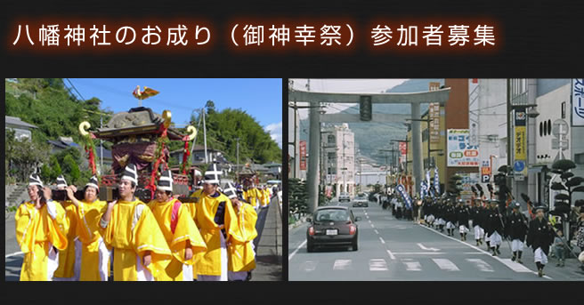 八幡神社の御神幸祭は、神社にとって最も大切な例祭(11月1日)の翌日、11月2日に行われます。 御神幸祭は、地元では「八幡宮のお成り」として親しまれ、御祭神にお遷りいただいた3基の鳳輦(御神輿)を中心に、そのお供である約260名が時代衣装に身を包み、大洲市街約12kmを巡幸するものです。 鳳輦(神輿)を護るお長柄組は、かつては大洲藩士が奉仕しました。その歩調は独特で、大洲藩の参勤交代の時の歩調といわれています。現代のお長柄組にもその独特の歩調が受け継がれています。
