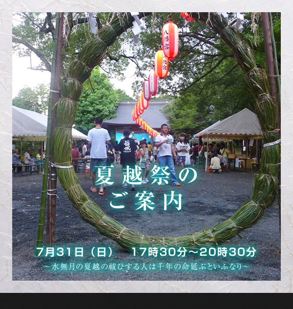 夏越祭は、この半年のうちに知らず知らずのうちに身についてしまった罪穢れを祓い、すがすがしい気持ちで今年の後半を迎えるとともに無病息災を願う神事です。