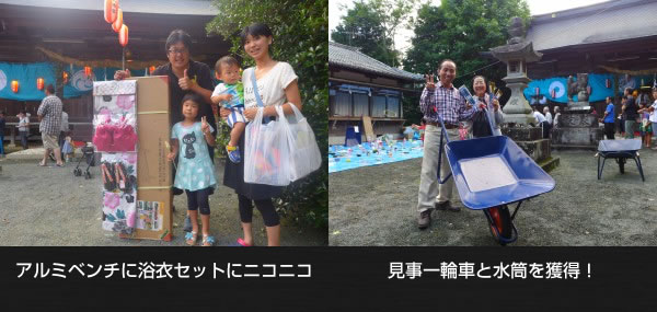 例年大人気の輪投げですが、今年の景品は、定番の「草刈機」「一輪車」に加え、「扇風機」や妖怪ウォッチ、アンパンマンなどのキャラクターグッズ、おもちゃ、浴衣やビニールプール、採れたての野菜や果物など今年も盛りだくさんです。お楽しみに!